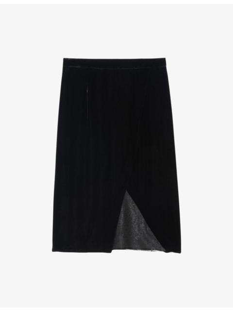 Stone-Embellished Ruched Stretch-Woven Midi Skirt