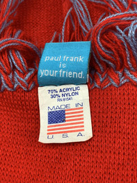 PAUL FRANK INDUSTRIES Scarf / Muffler Big Logo and spell out. Made in USA 70% acrylic, 30% Nylon This is used item and still in best condition. | No stains | No holes | Bright color | Length: 60 inches Width: 8 inches Refer pictures for more details. Disclaimer ** Picture there may be slight differences compared to the actual color ** 🤟🏻Willing to accept any reasonable offer 💵 Combine multiple package will save on shipping cost and more discount. 🛫 Ship them using priority shipment which will reach you within 7-14 working days Thanks for viewing and have a nice day. SC022