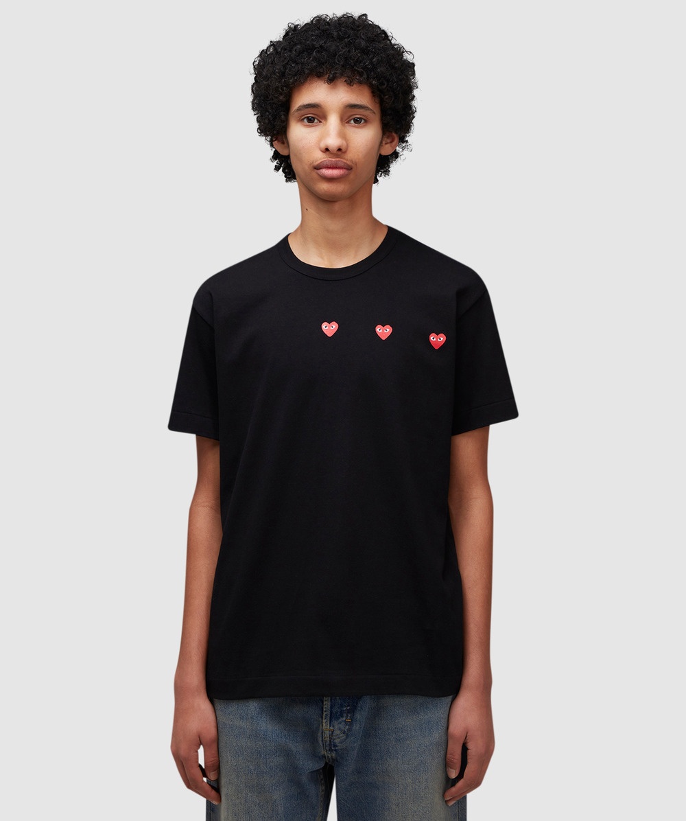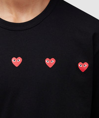 Incorporate Comme des Garcons PLAY signature red heart branding into your everyday wardrobe with the Horizontal hearts t-shirt - a premium staple with a playful finish. • Regular fit • Ribbed crewneck • Graphic logo branding • 100% cotton • Made in Japan • Item code: P1T337 1 Product Information • 4098418