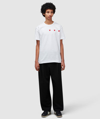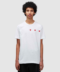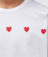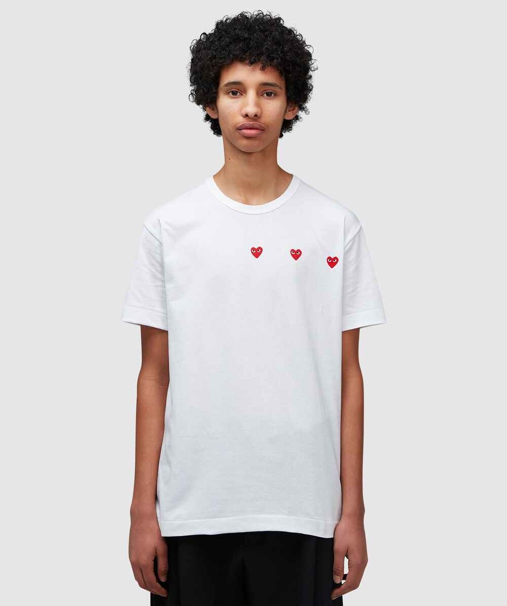 Incorporate Comme des Garcons PLAY signature red heart branding into your everyday wardrobe with the Horizontal hearts t-shirt - a premium staple with a playful finish. • Regular fit • Ribbed crewneck • Graphic logo branding • 100% cotton • Made in Japan • Item code: P1T337 3 Product Information • 4098419