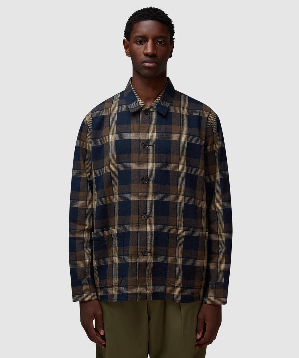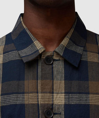 Inspired by a jacket found in a Parisian market, the Universal Works Travail workwear influences with contemporary style. Crafted from premium materials, this latest is perfect for layering and everyday wear. • Relaxed, unstructured fit • One piece shirt collar • Button up fastening • Dual lower patch pockets • Adjustable button cuff • Curved hem • Item code: 32559 NAVY/BROWN Product Information • 4114329