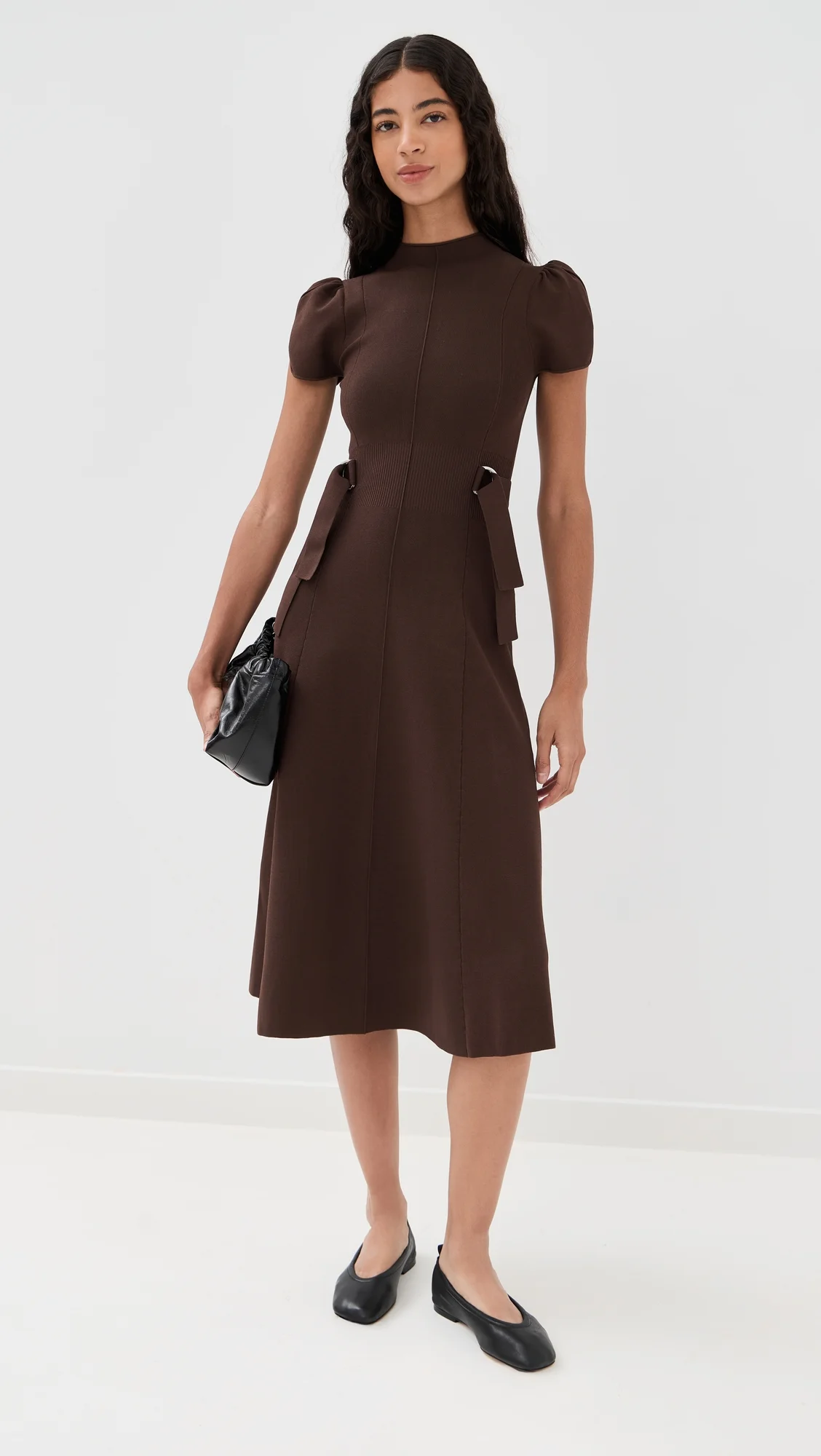 - Fabric: Mid-weight compact knit with stretch - Ribbed detailing at waist - Adjustable D-ring buckle tabs - Midi length - Mock neck - Short cap sleeves - Pullover design, no closure - Shell: 63% viscose/20% nylon/15% polyester/2% elastane - Unlined - Dry clean - Imported, China Style #PHLII26086