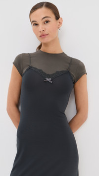 - Fabric: Lightweight silky jersey with stretch - Layered design - Lace trim with bow detail - Midi length - Crew neck - Pullover design, no closure - Shell: 93% viscose/7% elastane - Trim: 90% cotton/10% elastane - Unlined - Dry clean - Made in Portugal - Short sleeves Style #ACNDB32332 Size & Fit Model measurements: Size XS: Mia (5'9.5") usually wears size XS Measurements from size XS Length: 48in / 122.0cm, from shoulder