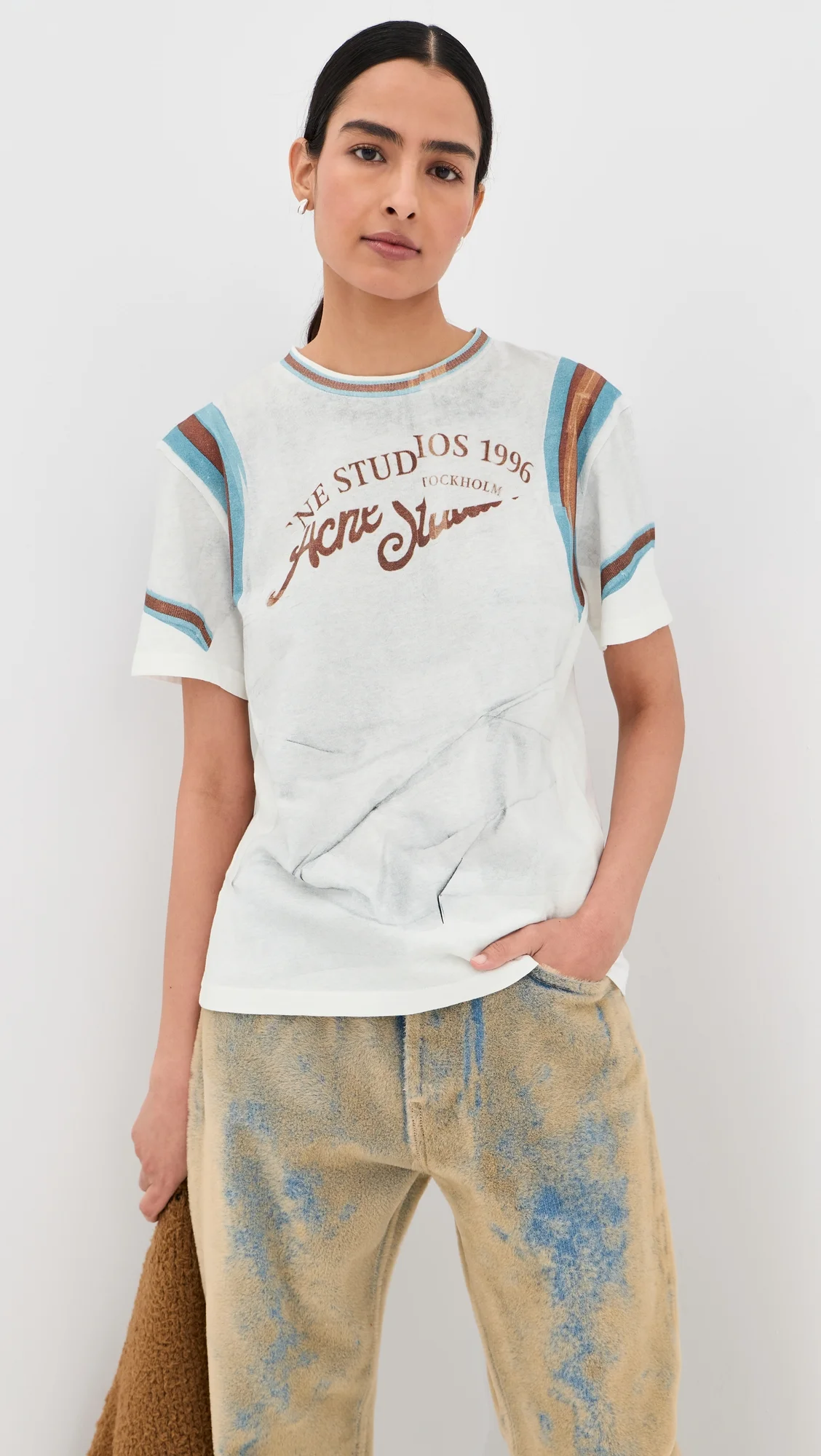 - Fabric: Lightweight stretch jersey - Crumpled shirt print - Stripe details - Crew neck - Short sleeves - Shell: 100% cotton - Wash cold - Made in Portugal Style #ACNDB32508 Size & Fit Model measurements: Size XS: Priyanka (5'9") usually wears size XS Measurements from size XS Length: 24in / 61.0cm, from shoulder