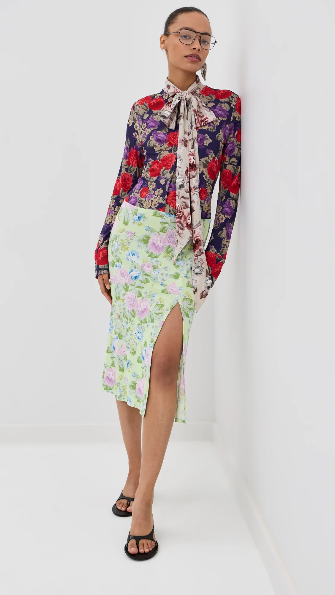 - Fabric: Mid-weight stretch crepe - Floral print - Slit at hem - Scarf tie at neck - Midi length - Polo neckline - Long sleeves with button cuffs - Partial button placket - Shell: 100% viscose - Unlined - Dry clean - Made in Portugal Style #ACNDB32530 Size & Fit Model measurements: Size 34: Alexis (5'8") usually wears size 32-34 Measurements from size 32 Length: 45in / 114.0cm, from shoulder