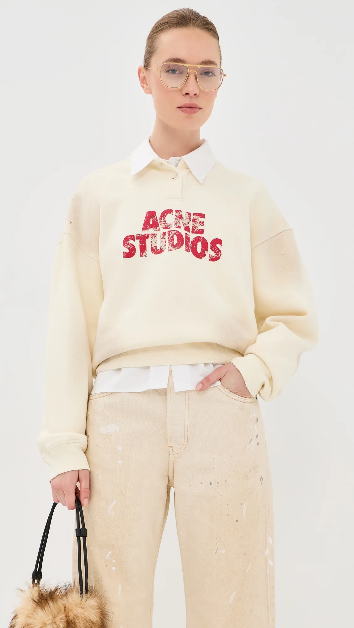 - Fabric: Mid-weight stretch fleece - Logo lettering at front - Distressed details - Crew neck - Long sleeves - Partial button placket - Shell: 100% cotton - Wash cold - Made in Portugal Style #ACNDB32511 Size & Fit Model measurements: Size XS: Lila (5'10") usually wears size XS Measurements from size S Length: 22.5in / 57.0cm, from shoulder