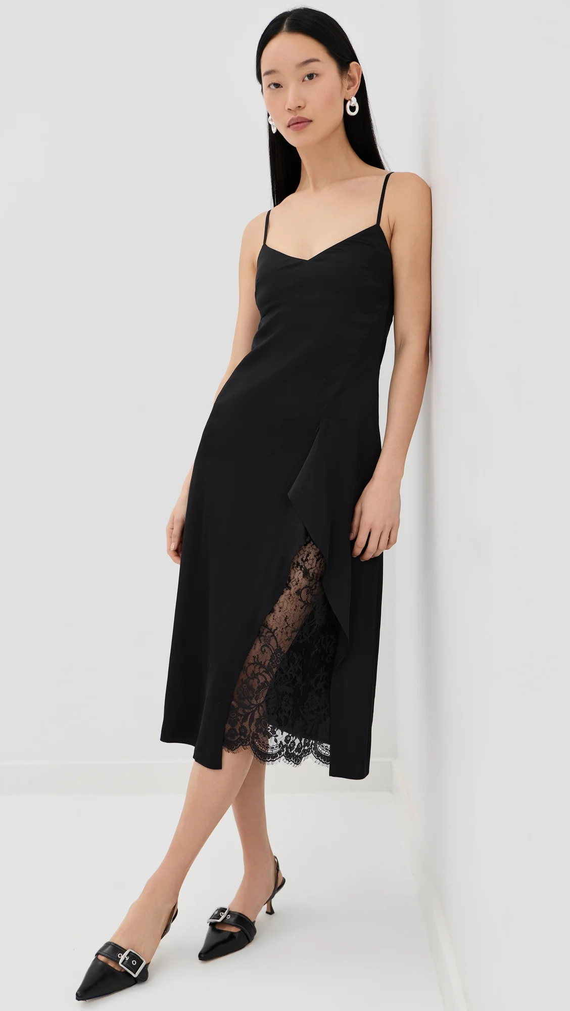 - Fabric: Lightweight stretch satin - Lace underlay - Slit at front - Midi length - V neck - Adjustable shoulder straps - Hook-and-eye and hidden zip at side - Shell: 97% viscose/3% elastane - Lining: 52% cotton/48% nylon - Dry clean - Imported, China Style #ACNDB32513 Size & Fit Model measurements: Size 32: Jiwon (5'8.5") usually wears size 32 Measurements from size 34 Length: 45.25in / 115.0cm, from shoulder