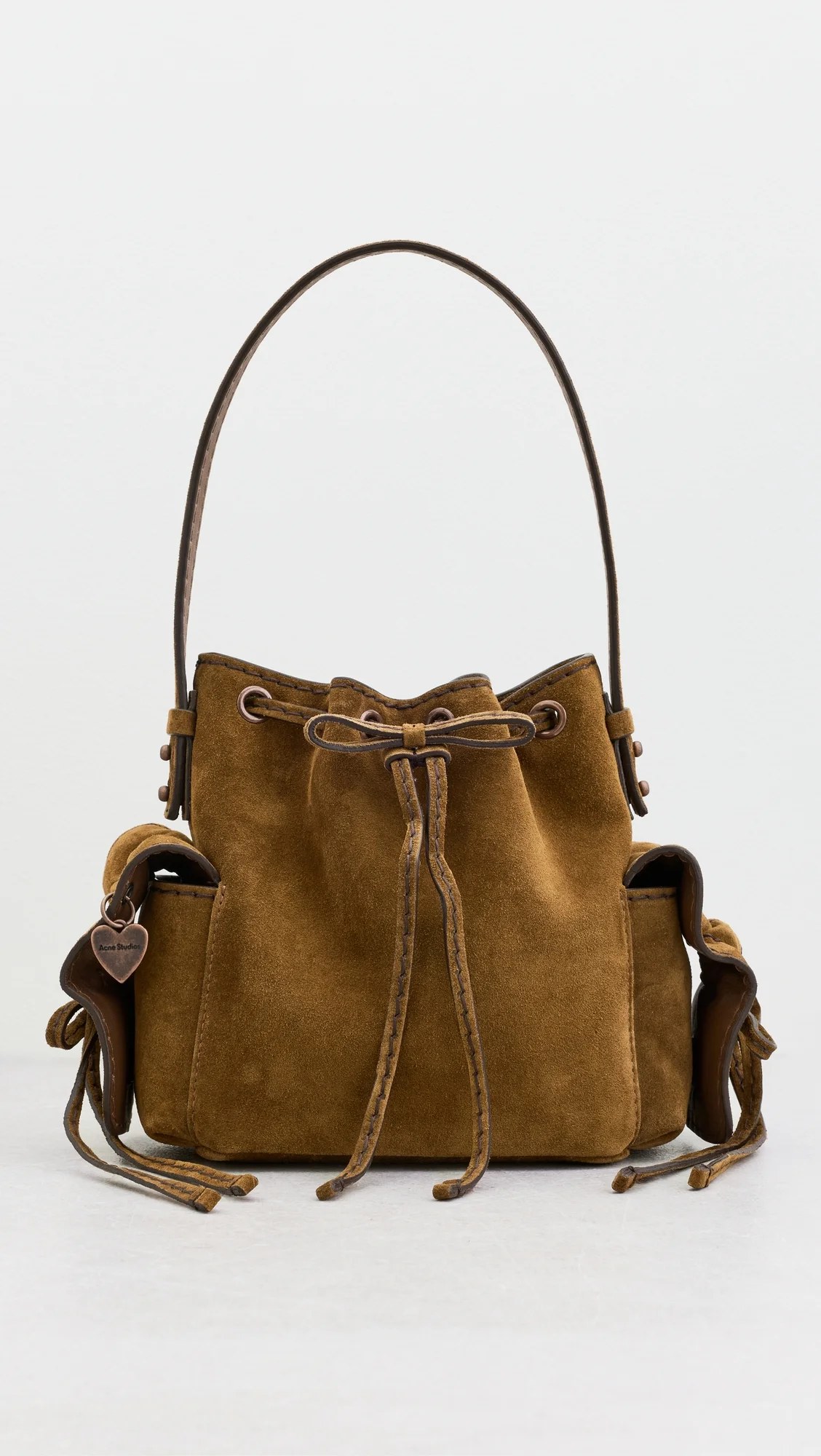 - Suede - Classic bucket shape - Tonal topstitching - Drawstring top - Flap exterior pockets - Removable strap - Lining: Leather - Weight: 16oz / 0.45kg - Made in Italy Style #ACNDB32570 Size & Fit Length: 6.75in / 17cm Height: 7in / 18cm Depth: 2.25in / 6cm Strap drop: 19.75in / 50cm Handle drop: 6.25in / 16cm