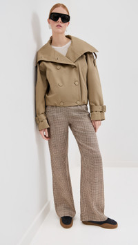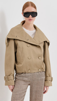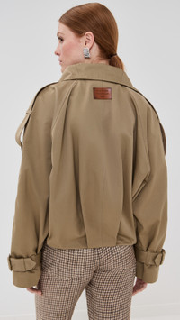 - Fabric: Mid-weight, non-stretch twill - Adjustable buckle straps at cuffs - Logo patch at back - Collared neck - Long sleeves - Double-breasted button placket - Covered elastic waistband - Welt front pockets - Welt interior pocket with snap closure - Shell: 100% cotton - Lined - Dry clean - Imported, Romania Style #ACNDB32404 Size & Fit Model measurements: Size 34: Haley (5'9.5") usually wears size 34 Measurements from size 34 Length: 23.25in / 59.0cm, from shoulder