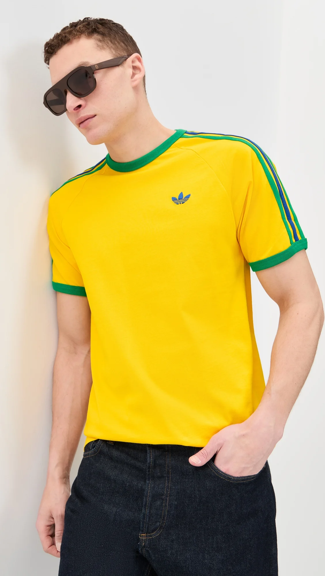 - Fabric: Lightweight stretch jersey - Embroidered logo - Contrast stripes - Ribbed edges - Crew neck - Short sleeves - Shell: 100% cotton - Wash cold - Imported, Pakistan Style #ADDAS30640 Size & Fit Model measurements: Size M: Louis (6'0") usually wears size M Measurements from size M Length: 29.5in / 75cm Chest: 41in / 104cm