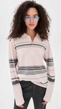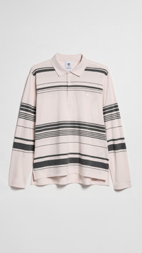 - Fabric: Lightweight stretch knit - Stripe pattern - Polo neckline - Long sleeves - Shell: 100% recycled polyester - Wash cold - Imported, China Style #AWBON30020