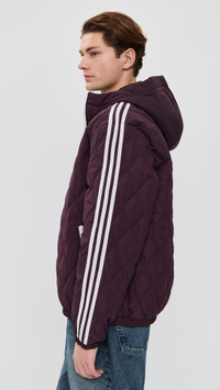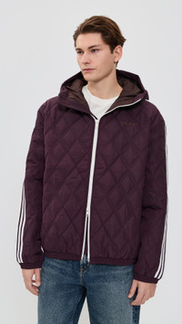 - Fabric: Heavyweight, non-stretch technical weave - Embroidered logo at chest - Contrast mesh stripes - Diamond quilted design - Hooded neckline - Long sleeves with elastic cuffs - Two-way zip closure - Covered elastic waistband - Zip exterior and interior pockets - Shell: 100% polyester - Lined - Lining: 100% polyester - Fill: 100% polypropylene - Wash cold - Imported, China Style #AWBON30030 Size & Fit This style is unisex. For men’s sizing, take your usual size. For women’s sizing, take one size down from your usual size. Model measurements: - Size XS: Rocio (5'11") usually wears size XS - Size M: Keanu (6'0") usually wears size M Measurements from size S Length: 26.75in / 68cm Sleeve: 34.75in / 88cm Chest: 53.5in / 136cm