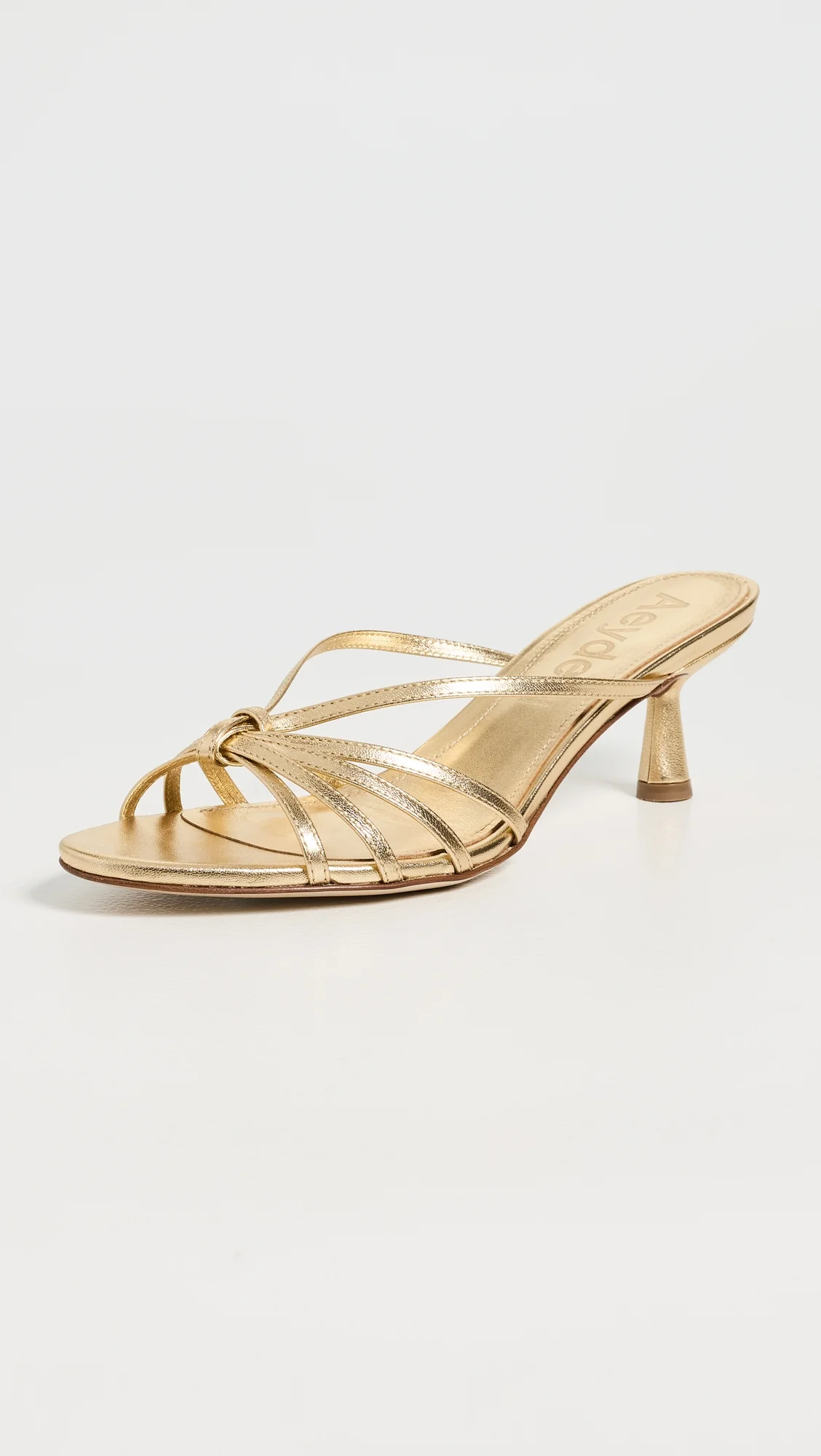 - Upper: Leather - Metallic finish - Knotted detail at toe - Lining: Leather - Stiletto heel - Slip on - Open toe - Leather sole with rubber heel cap - Made in Italy - This item cannot be gift-boxed Style #AEYDE30261 Size & Fit Heel: 2.25in / 55mm