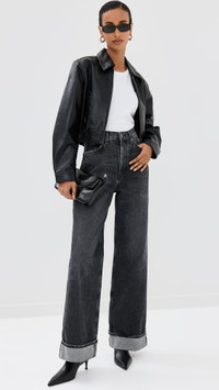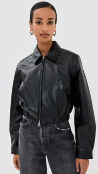 - Fabric: Mid-weight stretch leather - Collared neck - Two-way zip closure - Covered elastic waistband - Welt front pockets - Shell: 50% recycled leather/30% polyurethane/10% polyester/10% viscose - Lined - Lining: 100% polyester - Leather clean - Imported, India - Long sleeves with snap cuffs Style #AGOLE31014 Size & Fit Customers say: Runs large; please size down. Model measurements: Size XS: Mical (5'10") usually wears size XS Measurements from size XS Length: 19.25in / 49.0cm, from shoulder