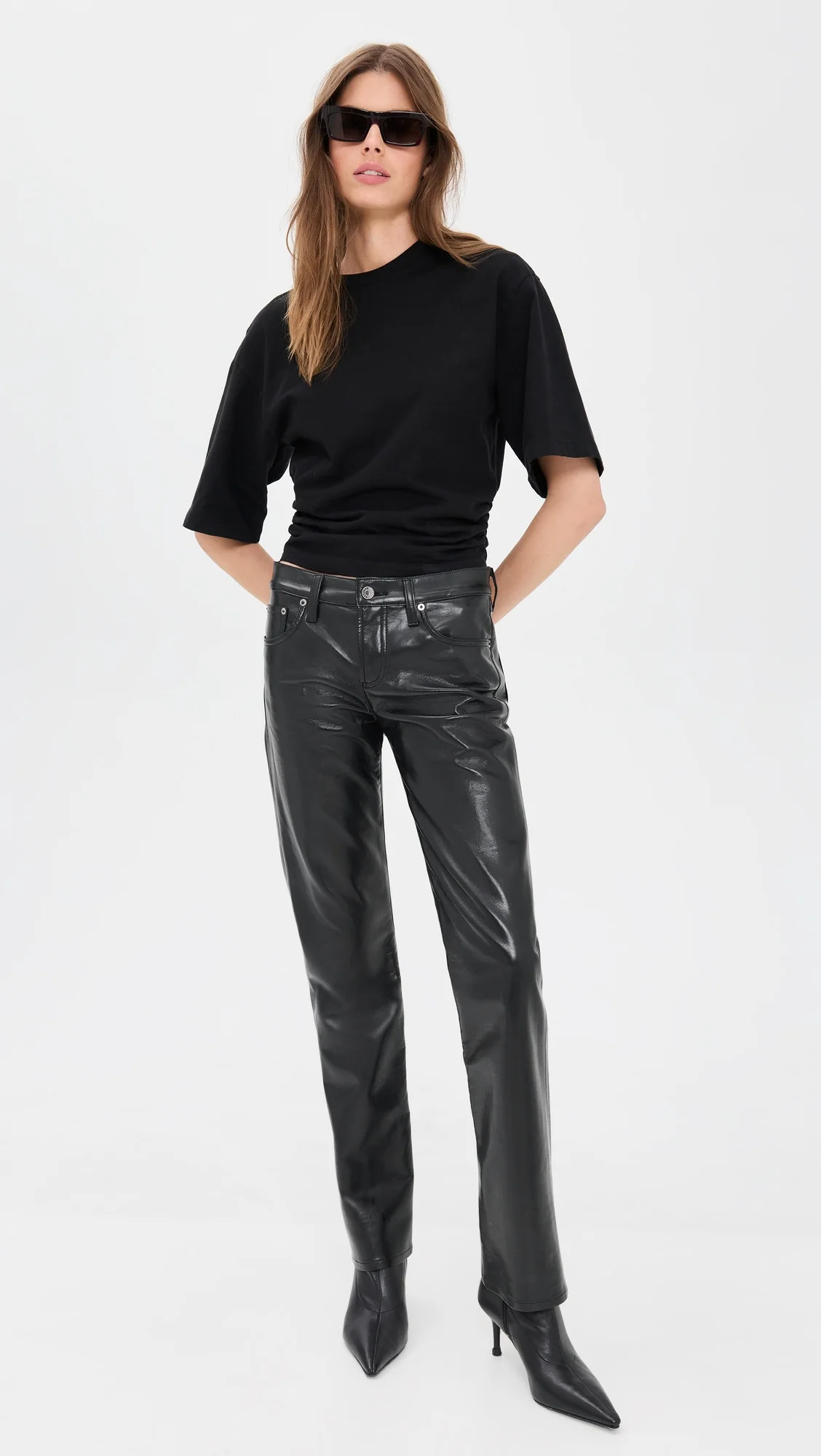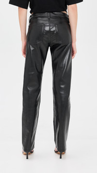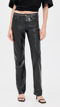 - Fabric: Mid-weight, non-stretch leather - Composed of 50% recycled leather - Button closure and zip fly - 5-pocket styling - Shell: 50% leather/30% polyurethane/10% polyester/10% viscose - Partially lined - Lining: 95% polyester/5% elastane - Dry clean - Imported, Turkey Style #AGOLE31183 Size & Fit Model measurements: Size 25: Gwen (5'10") usually wears size 24 Measurements from size 25 Rise: 9in / 23cm Inseam: 31.5in / 80cm Leg opening: 15.25in / 39cm