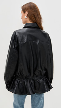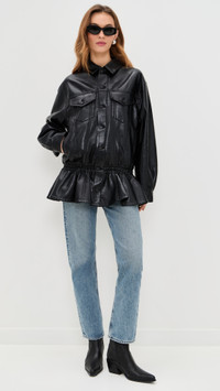 - Fabric: Mid-weight stretch leather - Ruffled hem - Collared neck - Long sleeves with button cuffs - Button placket - Covered elastic waistband - Patch breast pocket - Welt front pockets - Shell: 50% leather/30% polyurethane/10% polyester/10% viscose - Lined - Lining: 100% polyester - Dry clean - Made in the USA of imported materials Style #AGOLE31214 Size & Fit Model measurements: Size XS: Mia (5'9.5") usually wears size XS Measurements from size XS Length: 28.25in / 72.0cm, from shoulder