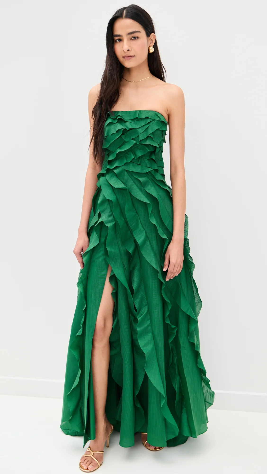 - Fabric: Mid-weight, non-stretch organza - Cascading ruffles - Structured bodice - Smocked elastic back panel - Maxi length - Strapless - Sleeveless - Hook-and-eye and hidden zip at back - Shell: 100% polyester - Lined - Lining: 100% cotton - Dry clean - Imported, China Style #AJEEE30407 Size & Fit Model measurements: Size 4: Priyanka (5'9") usually wears size 4 Measurements from size 4 Length: 55in / 140.0cm, from center back