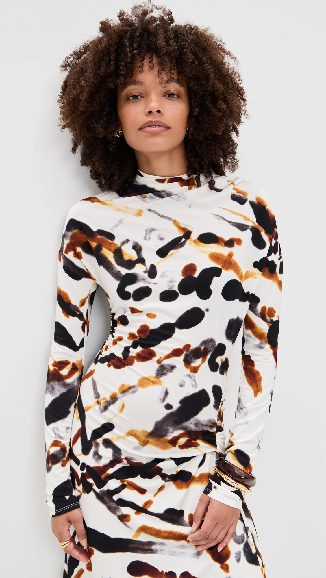 - Fabric: Lightweight, super-stretch fine jersey - Abstract ink print - Ruched detailing - Asymmetrical hem - Maxi length - Mock neck - Long sleeves with dropped shoulders - Hook-and-eye and hidden zip at back - Shell: 85% viscose/15% elastane - Unlined - Dry clean - Imported, China Style #ALCCC43001