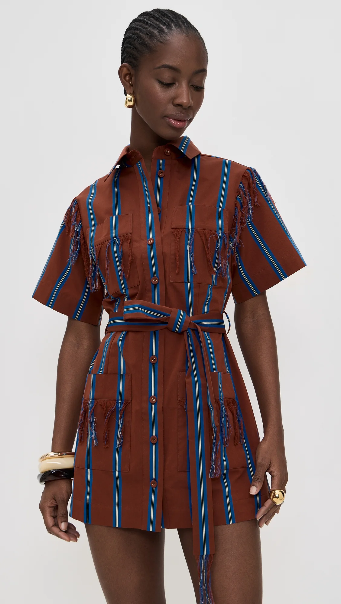 - Fabric: Lightweight, non-stretch poplin - Stripe print - Fringe edges - Mini length - Collared neck - Short sleeves - Button placket - Optional tie self-belt - Patch front pockets - Shell: 89% cotton/11% nylon - Unlined - Wash cold - Imported, China Style #ALEMA30362