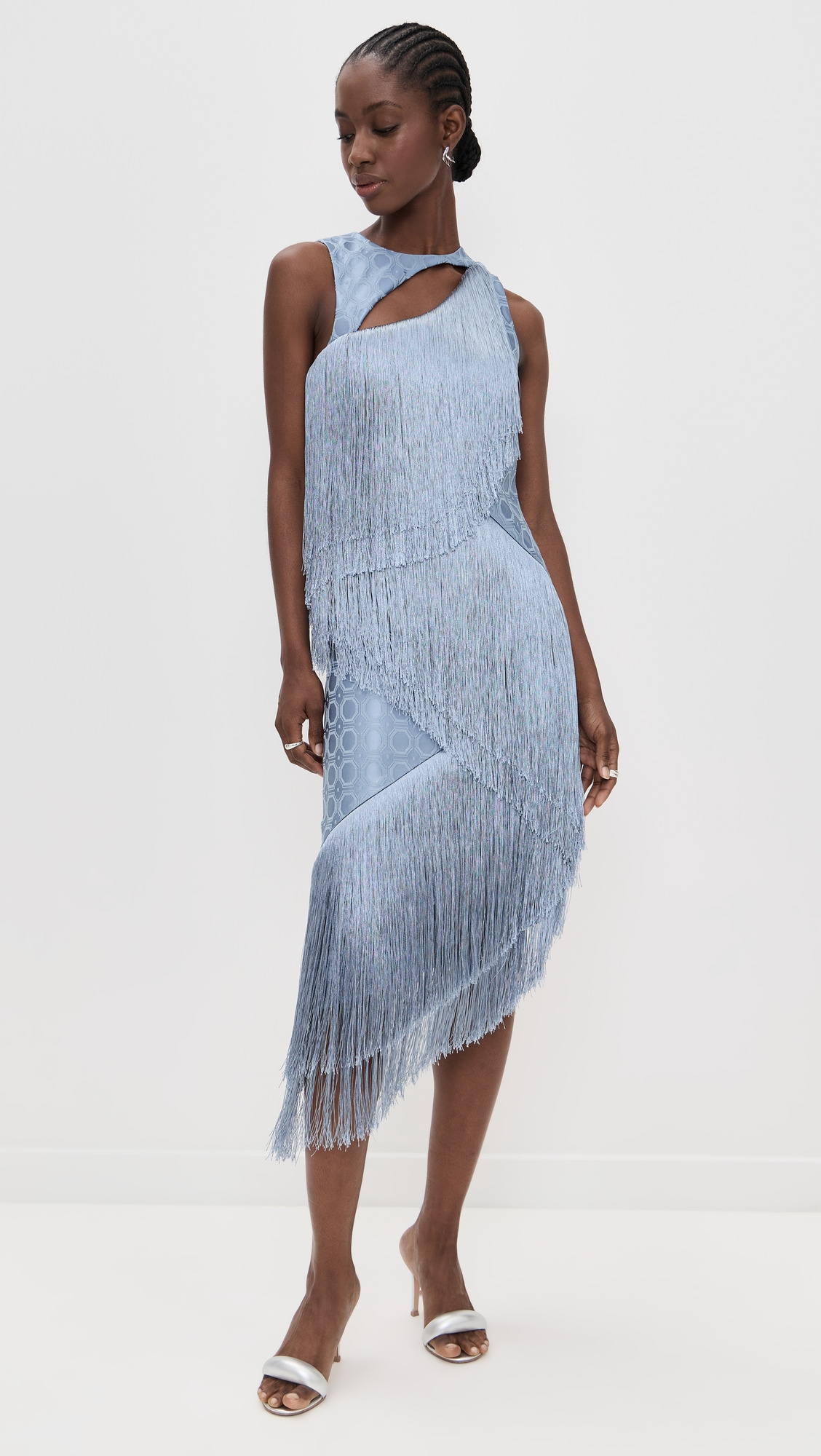 - Fabric: Heavyweight, non-stretch jacquard - Layered fringe trim - Cutout at bust - Asymmetrical design - Maxi length - Crew neck - Sleeveless - Hook-and-eye and hidden zip at back - Shell: 65% cotton/35% rayon - Lined - Lining: 95% polyester/5% elastane - Dry clean - Imported, China Style #ALXIS20910