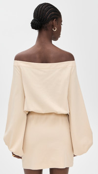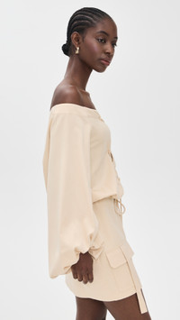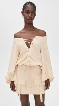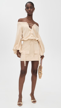- Fabric: Lightweight, non-stretch sateen - Zigzag lace-up at front - Optional drawstring self-tie - Mini length - Off-shoulder neckline - Long puff sleeves - Hook-and-eye and hidden zip at side - Patch front pockets - Shell: 62% tencel lyocell/35% cotton/3% elastane - Unlined bodice, lined skirt - Lining: 100% polyester - Dry clean - Made in Italy Style #ALXIS20884