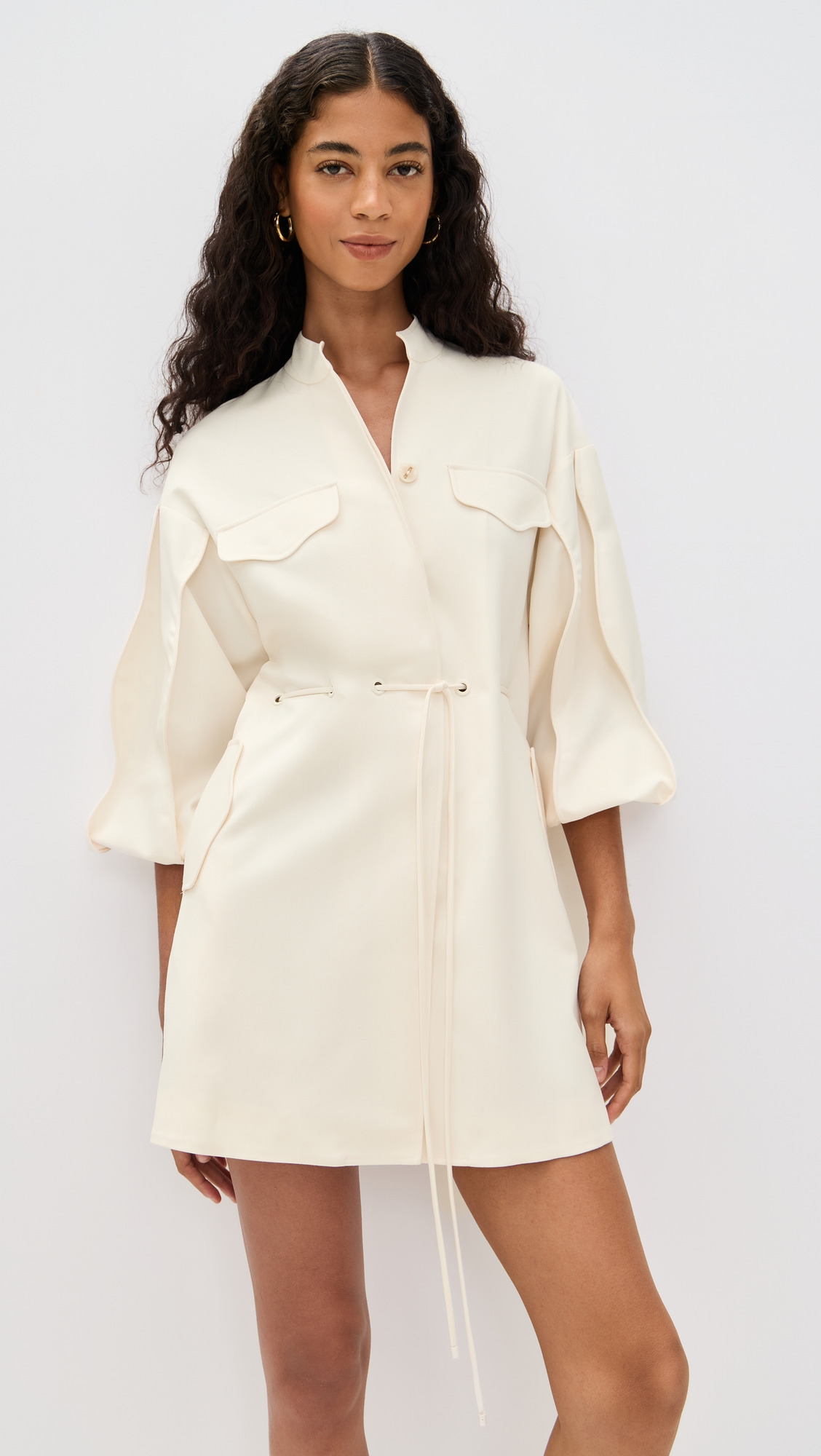 - Fabric: Mid-weight, non-stretch twill - Faux flap breast pockets - Mini length - Collared neck - 3/4 sleeves - Self-belt at waist - Covered button placket - On-seam side pockets - Shell: 80% polyester/20% cotton - Lined - Lining: 100% polyester - Dry clean - Imported, China Style #ALXIS20902