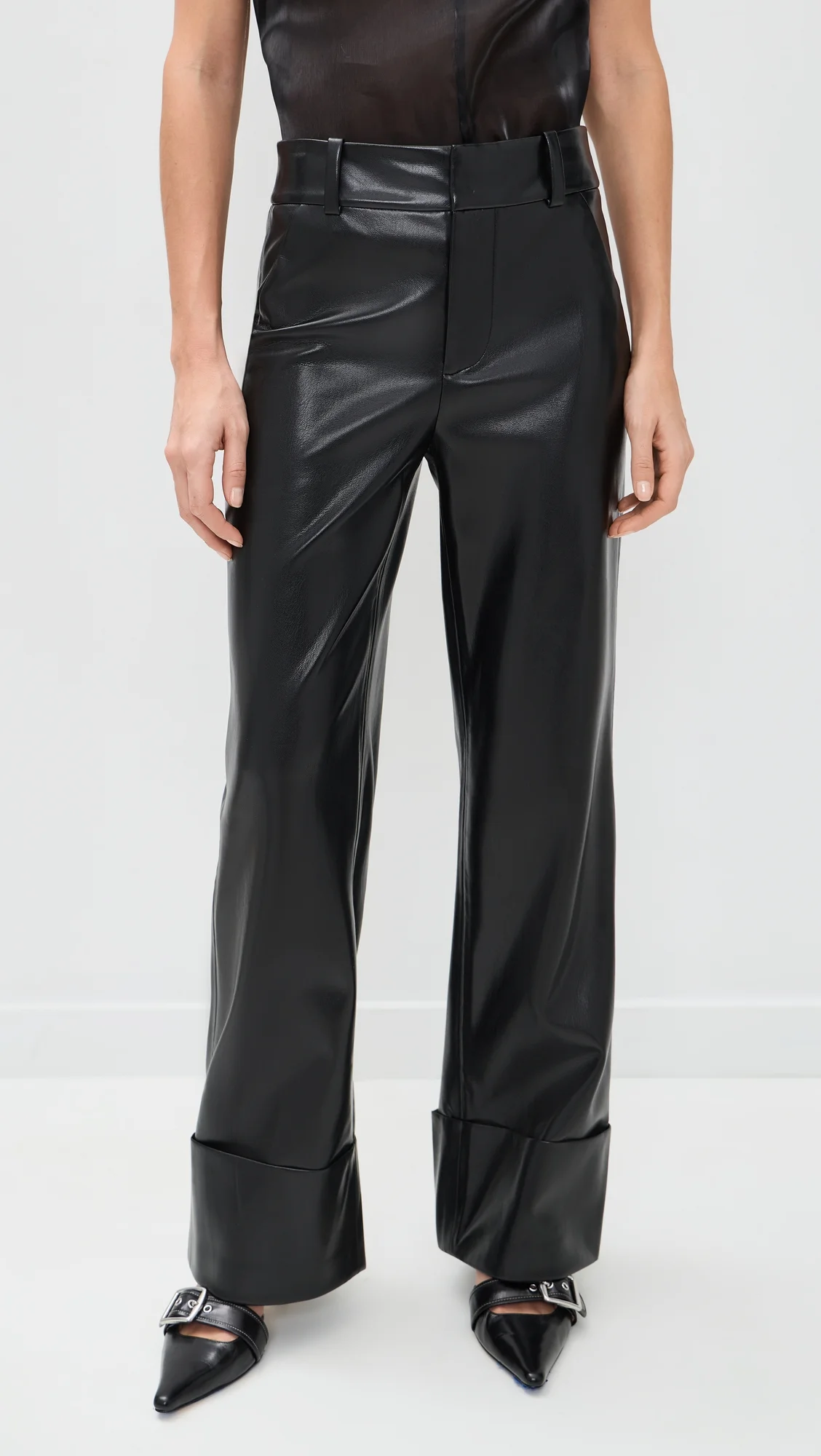 - Fabric: Mid-weight, low-stretch faux leather - Pant cuffs - Hook-and-eye closures at waist, zip fly - Faux slant hip pockets and welt back pockets - Shell: 100% polyurethane - Dry clean - Imported, Vietnam Style #ALICE47348 Size & Fit Model measurements: Size 0: Cai (5'7") usually wears size 0 Measurements from size 0 Rise: 10.25in / 26cm Inseam: 30in / 76cm Leg opening: 18in / 46cm