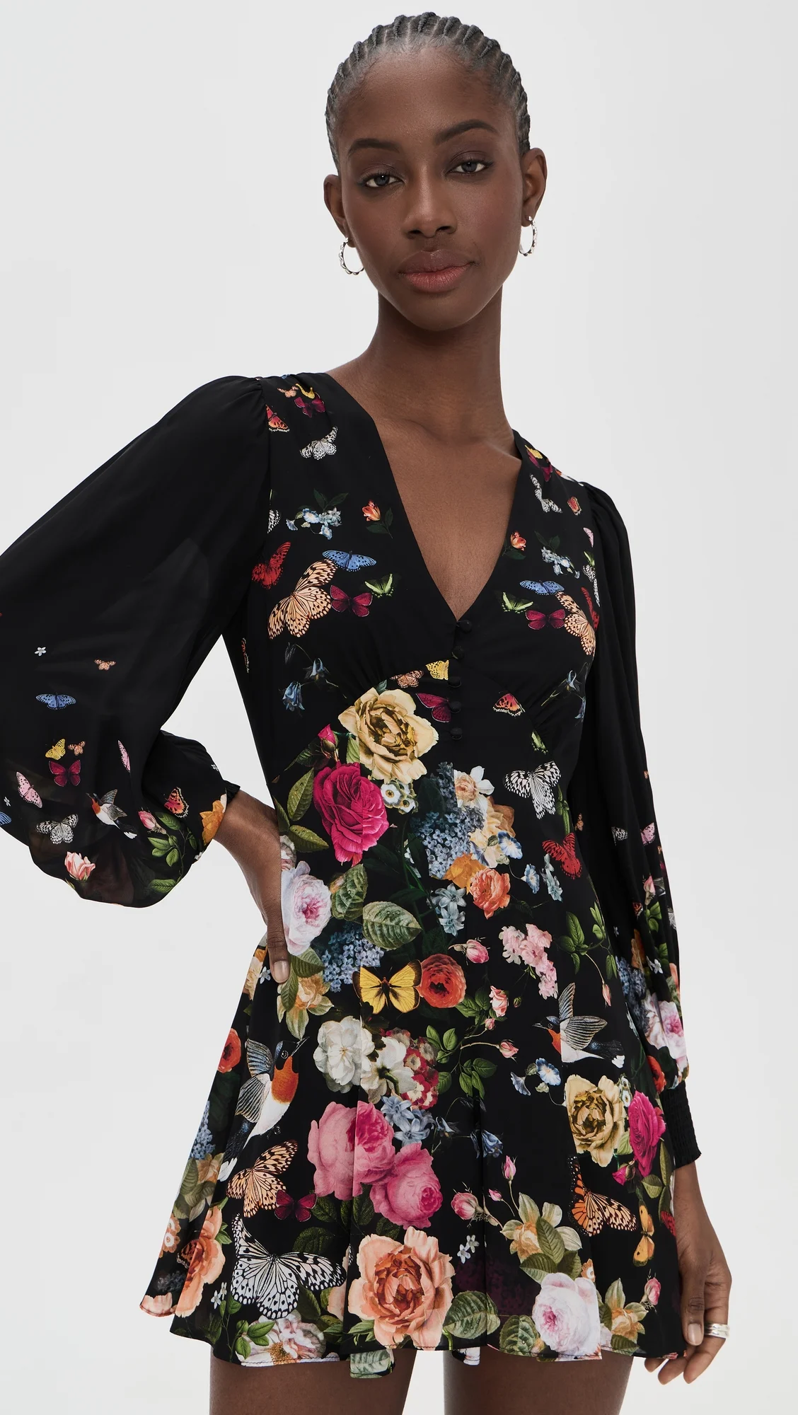 - Fabric: Lightweight, non-stretch chiffon - Floral print - Butterfly print - Mini length - V neck - Long sleeves with elastic cuffs - Hidden zip at back - Partial button placket - Shell: 100% viscose - Lined - Lining: 95% recycled polyester/5% elastane - Dry clean - Imported, Vietnam Style #ALICE47381 Size & Fit Model measurements: Size 0: Cher (5'11") usually wears size 0 Measurements from size 0 Length: 31.5in / 80.0cm, from shoulder