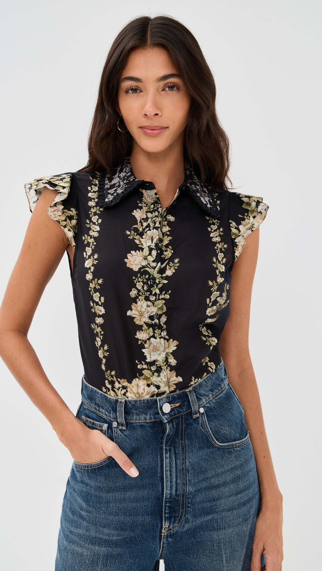 - Fabric: Lightweight, non-stretch silky weave - Floral print - Collared neck - Short flutter sleeves - Button placket - Shell: 70% cotton/30% silk - Dry clean - Imported, China Style #ALICE47100 Size & Fit Model measurements: Size XS: Brittany (5'9.5") usually wears size XS Measurements from size XS Length: 21.25in / 54.0cm, from shoulder