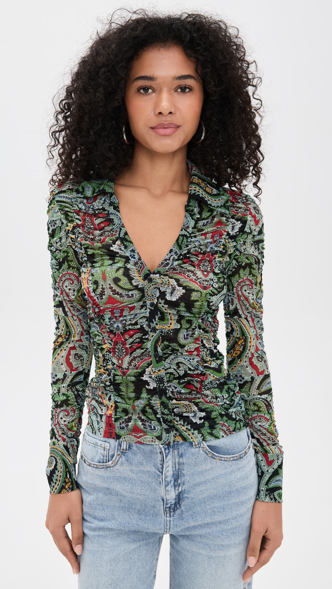 - Fabric: Lightweight, super-stretch mesh - Paisley print - Allover ruching - Collared neck - Long sleeves - Button placket - Shell: 90% polyester/10% elastane - Dry clean - Imported, Cambodia Style #ALICE47141 Size & Fit Model measurements: Size XS: Eyshila (5'10") usually wears size XS Measurements from size XS Length: 19.75in / 50.0cm, from shoulder