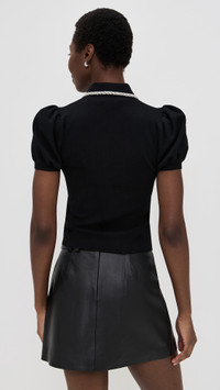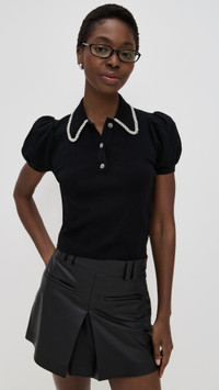 - Fabric: Lightweight, super-stretch knit - Beaded details at collar and buttons - Collared neck - Short puff sleeves with elastic cuffs - Partial button placket - Shell: 80% wool/17% nylon/3% elastane - Spot clean - Imported, China Style #ALICE47339