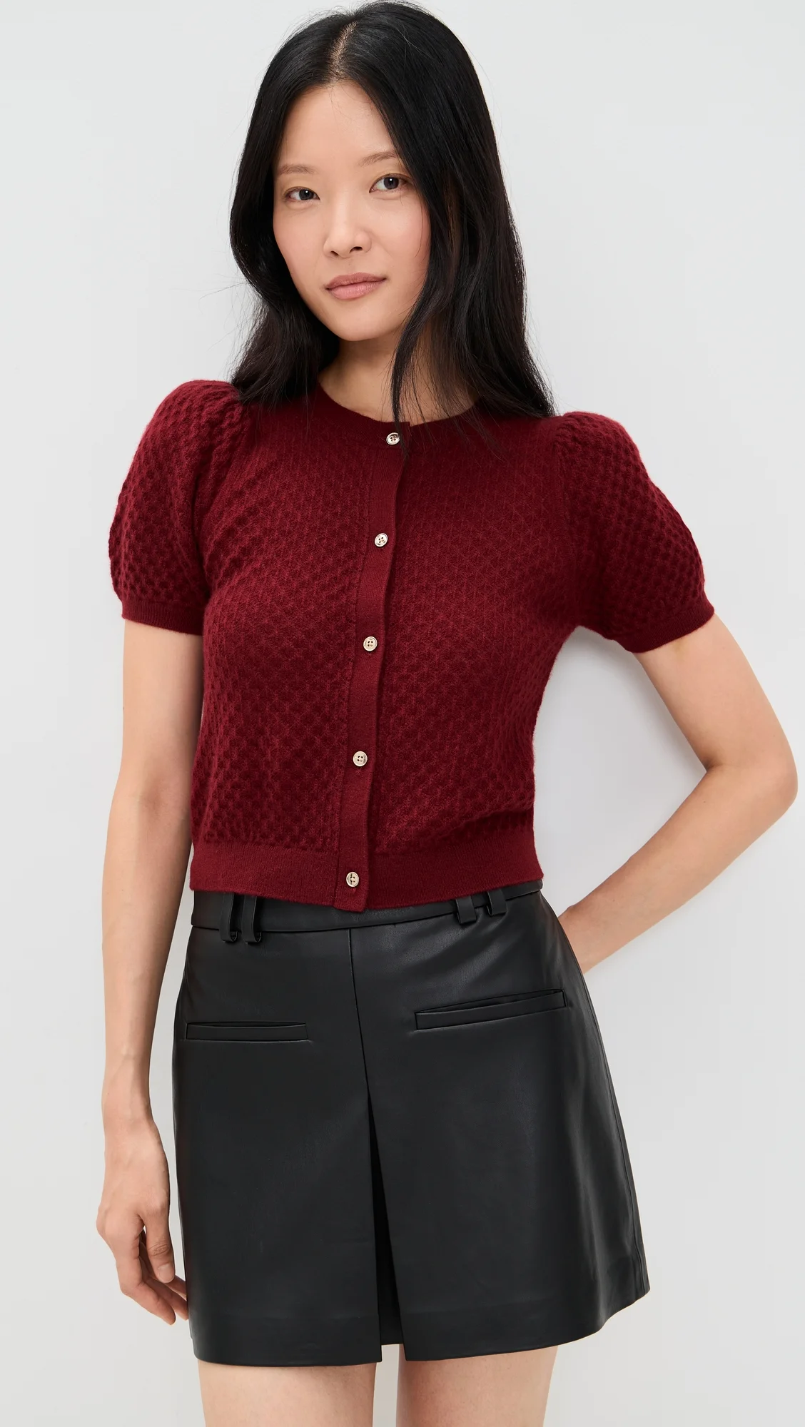 - Fabric: Lightweight textured knit with stretch - Ribbed trim - Crew neck - Short puff sleeves - Button placket - Shell: 97% cashmere/3% nylon - Dry clean - Imported, China Style #ALICE47262