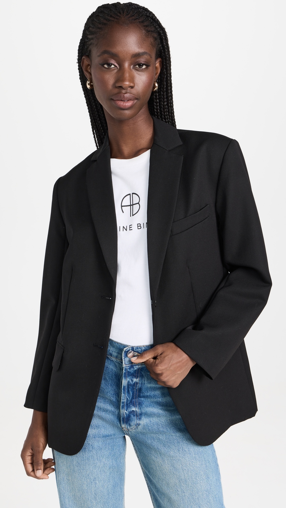 - Fabric: Mid-weight, non-stretch twill suiting - Collared neck with notched lapels - Long sleeves with button cuffs and padded shoulders - Single-breasted button placket - Flap front pockets, welt breast pocket - Shell: 100% wool - Lined - Lining: 57% polyester/43% viscose - Dry clean - Imported, China Style #ANINE30943 Size & Fit Wool suiting has a smooth, sturdy feel and offers no stretch. Shopbop’s expert stylist says: Runs large; designed with a boxy, oversized silhouette. For a slimmer fit, size down Customers say: Runs large Model measurements: Size XS: Cher (5'11") usually wears size XS Measurements from size S Length: 28.75in / 73.0cm, from shoulder