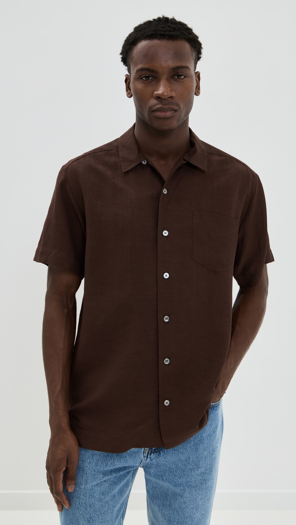 - Fabric: Lightweight, non-stretch weave - Collared neckline - Short sleeves - Button placket - Patch breast pocket - Shell: 65% viscose/35% linen - Dry clean - Imported, Tunisia Style #APCAA32767