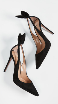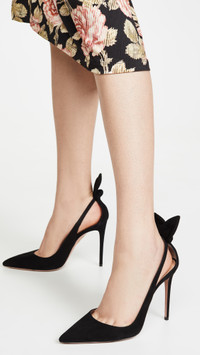 - Upper: Goatskin - Suede - Wired bow accent at back heel - Lining: Leather - Stiletto heel - Slip on - Pointed toe - Leather sole - Made in Italy - This item cannot be gift-boxed Style #AQUDB30684 Size & Fit Heel: 4.25in / 105mm