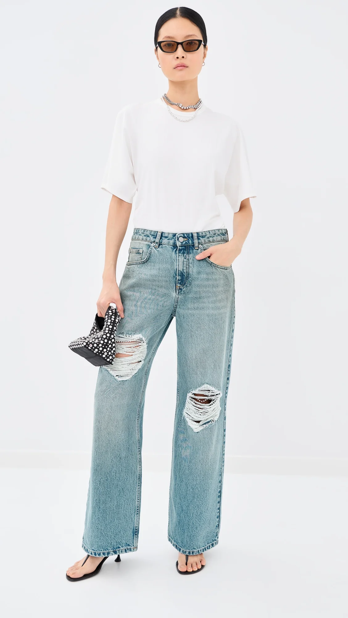 - Fabric: Mid-weight, non-stretch denim - Ripped accents with crystal embellishment - Button closure and zip fly - 5-pocket styling - Shell: 100% cotton - Wash cold - Made in Italy Style #AREAA30334 Size & Fit Model measurements: Size 26: Somin (5'10.5") usually wears size 25-26 Measurements from size 25 Rise: 11.5in / 29cm Inseam: 31in / 79cm Leg opening: 21.25in / 54cm