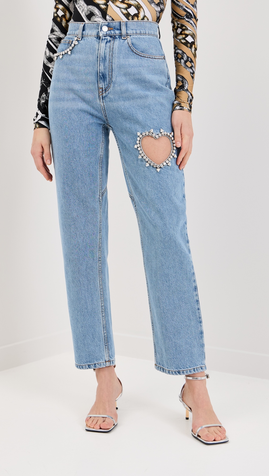 - Fabric: Lightweight, non-stretch denim - Heart cutout at side and heart shaped seams at back - Crystal embellishments - Button closure and zip fly - 5-pocket styling - Shell: 100% cotton - Wash cold - Made in Italy Style #AREAA30299 Size & Fit Model measurements: Size 26: Oksana (5'9") usually wears size 26 Measurements from size 26 Rise: 11.75in / 30cm Inseam: 28.25in / 72cm Leg opening: 15.75in / 40cm
