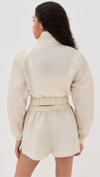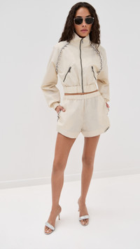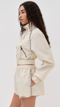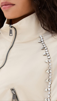 - Fabric: Lightweight, non-stretch technical weave - Crystal trim at front - Collared neck - Long sleeves with elastic cuffs - Zip at front - Covered elastic waistband - Zip front pockets - Shell: 100% nylon - Unlined - Dry clean - Imported, China Style #AREAA30308