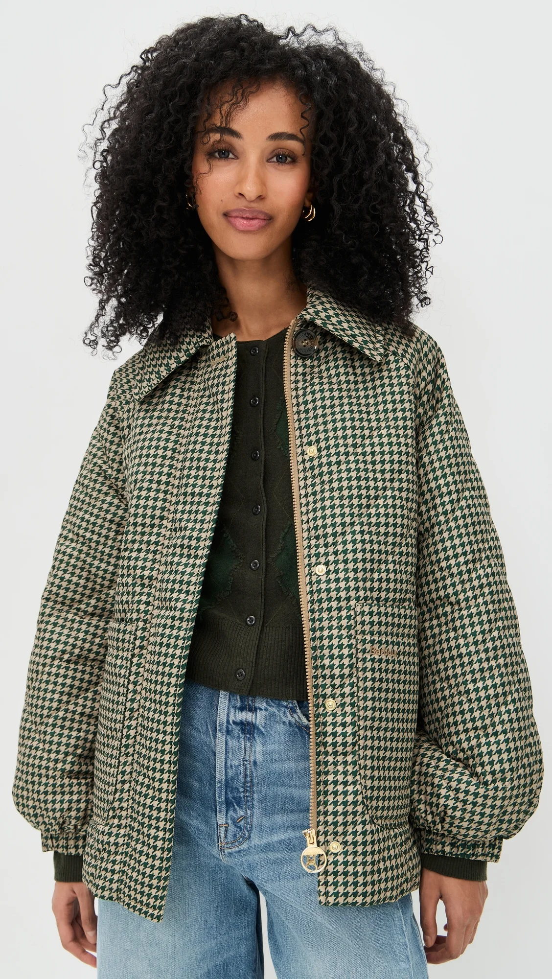 - Fabric: Mid-weight, non-stretch nylon - Houndstooth print - Collared neck - Long sleeves with elastic cuffs - Snap flap and hidden zip placket - Patch front pockets - Shell: 100% polyester - Lined - Fill: 100% polyester - Wash cold - Imported, Vietnam Style #BARBO30666
