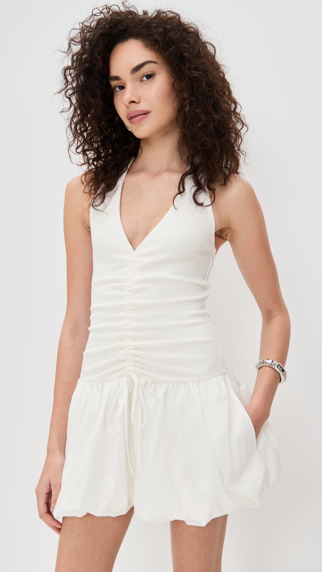 - Fabric: Lightweight, non-stretch poplin - Ribbed knit bodice - Bubble hem - Ruching at front - Halter neckline - Pullover design, no closure - Shell: 95% cotton/5% elastane - Trim: 100% cotton - Hand wash - Imported, China - Sleeveless Style #BECBR40607 Size & Fit Features a fitted bodice and a bubble skirt. Cotton poplin fabric has a smooth feel and offers no stretch. Shopbop’s expert stylist says: Runs true to size Model measurements: Size 6: Brianna (5'9") usually wears size 4 Measurements from size 6 Length: 32in / 81.0cm, from shoulder