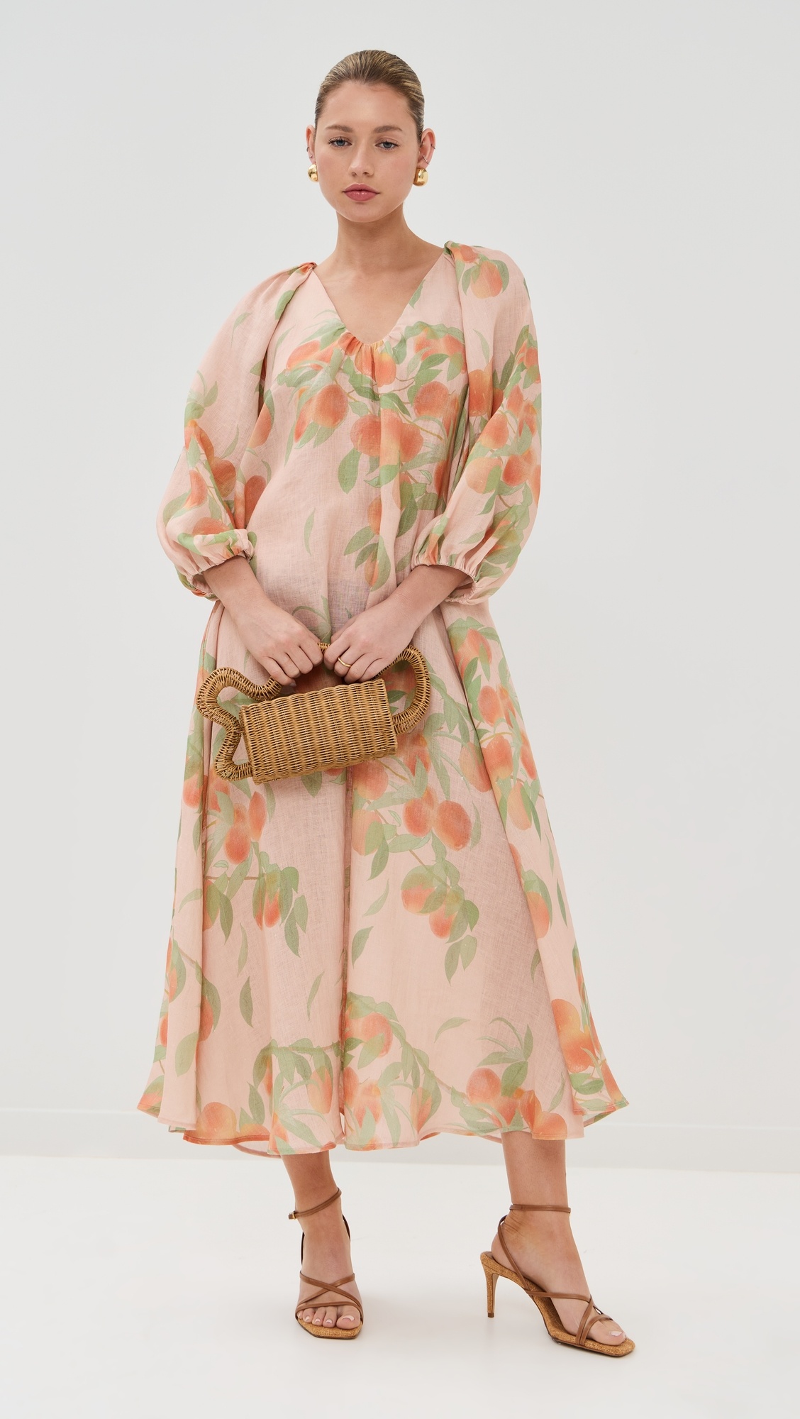 - Fabric: Lightweight, non-stretch linen weave - Peach tree print - Scoop neck - Long balloon sleeves - Pullover design, no closure - On-seam side pockets - Semi-sheer - Shell: 100% linen - Unlined - Dry clean - Imported, Romania Style #BERNA30066