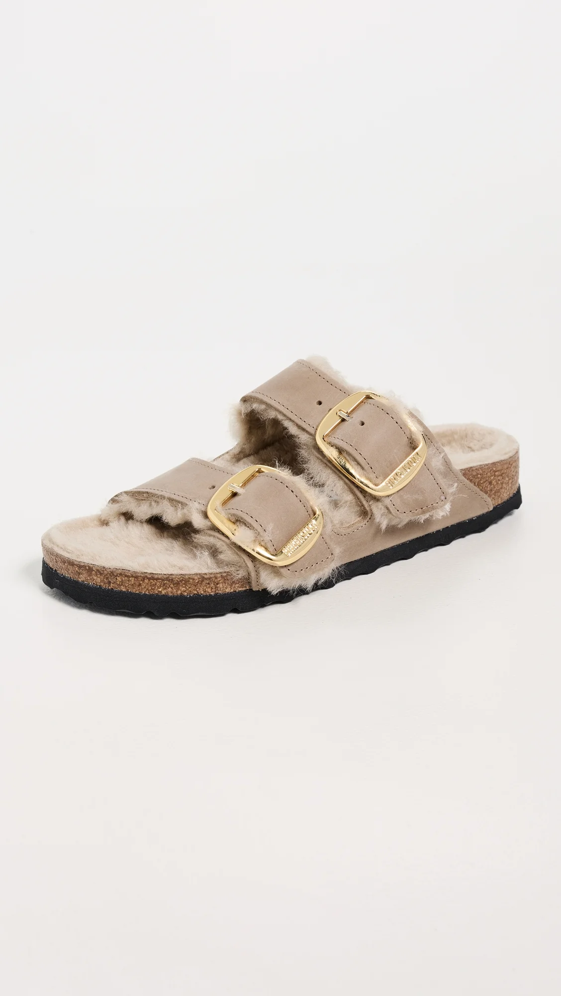 - Natural lamb shearling, from Spain - Upper: Cowhide - Narrow fit - Contoured cork footbed - Gold-tone buckles - Lining: Shearling - Buckle strap - Open toe - Rubber sole - Made in Germany - This item cannot be gift-boxed Style #BIRKE30724