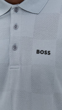 - Fabric: Lightweight, super-stretch activewear jersey - Moisture wicking and quick drying - Striped edges - Polo neckline - Short sleeves - Partial button placket - Shell: 100% cotton - Wash cold - Imported, Bangladesh Style #BHUGO30576 Size & Fit Model measurements: Size M: Idriss (6'1") usually wears size M-L Measurements from size M Length: 27.5in / 70cm Chest: 44in / 112cm