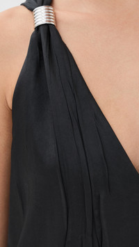 - Fabric: Heavyweight, non-stretch crinkled charmeuse - Polished silver-tone accents at shoulders - Maxi length - V neck - Sleeveless - Hook-and-eye and hidden zip at back - On-seam side pockets - Shell: 100% polyester - Lined - Lining: 100% silk - Dry clean - Made in the USA Style #BMAXW30211 Size & Fit Model measurements: Size 0: Margaret (5'11") usually wears size 0 Measurements from size 2 Length: 54.75in / 139.0cm, from shoulder
