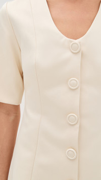 - Fabric: Heavyweight, non-stretch silky weave - Fitted waist - Mini length - Scoop neck - Short sleeves - Hook-and-eye and hidden zip at back - Decorative button placket - Shell: 59% polyester/41% cotton - Lined - Lining: 55% viscose/45% polyester - Wash cold - Imported, China Style #BYMLN40847 Size & Fit Customers say: Runs small; please size up. Model measurements: Size 32: Mia (5'9.5") usually wears size 32 Measurements from size 34 Length: 32.75in / 83.0cm, from shoulder