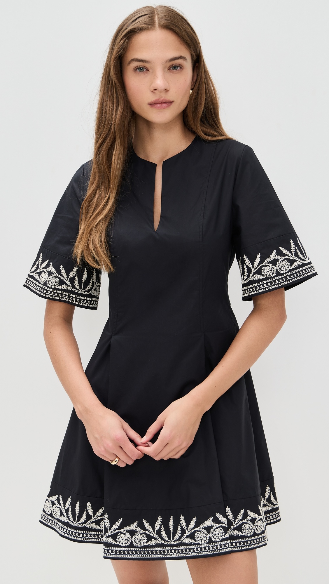 - Fabric: Mid-weight, non-stretch poplin - Embroidered garden vines at cuffs and hem - Mini length - Split neckline - Short sleeves - Hook-and-eye and hidden zip at back - Shell: 100% cotton - Unlined - Dry clean - Imported, China Style #BYMLN40844 Size & Fit Cotton fabric has a smooth feel and offers no stretch. Shopbop’s expert stylist says: Runs large; designed with a relaxed silhouette. For a slimmer fit, size down Model measurements: Size 34: Margaret (5'11") Measurements from size 36 Length: 35.5in / 90.0cm, from shoulder