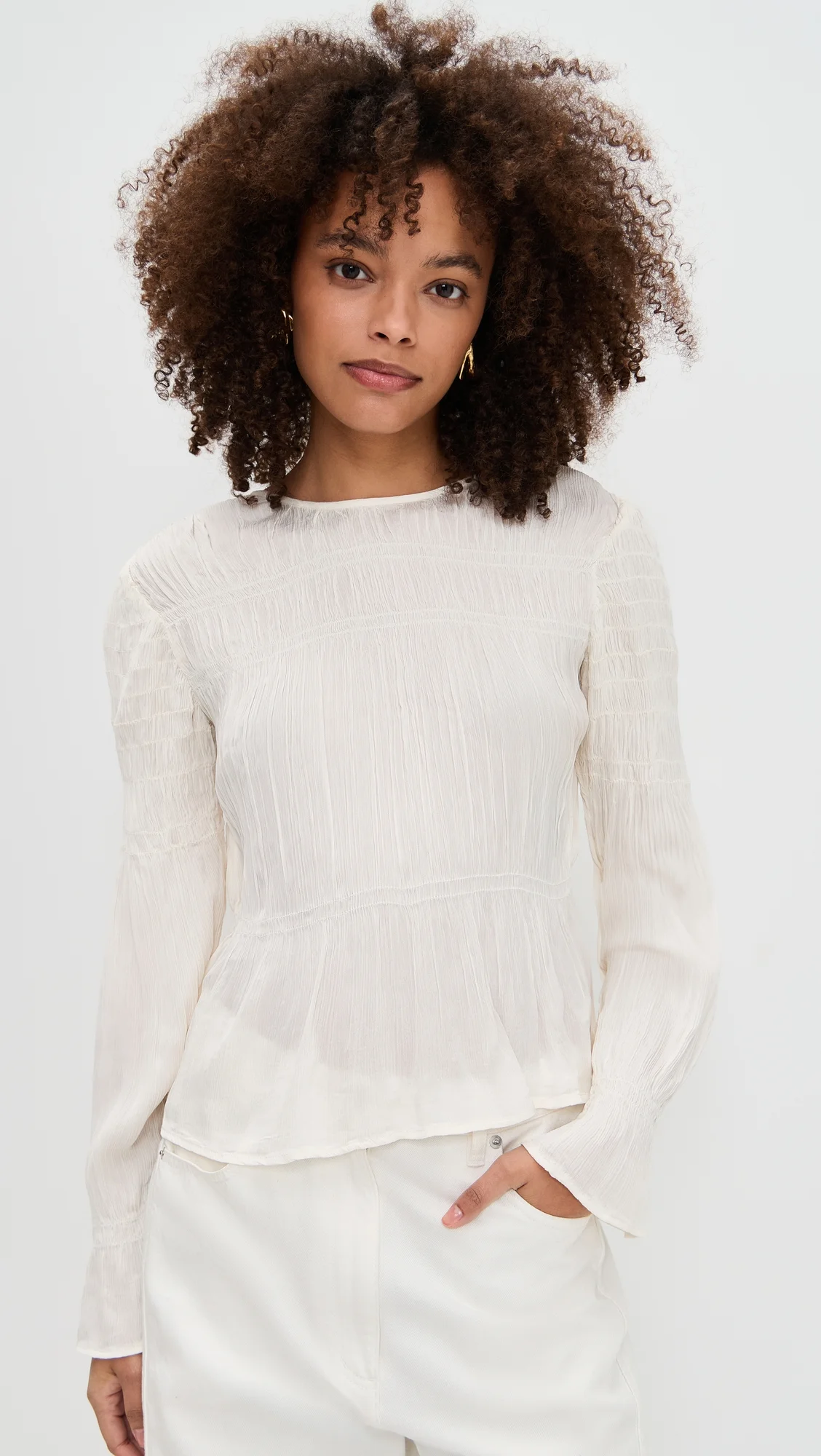 - Fabric: Lightweight, super-stretch crinkled crepe - Smock details - Crew neck - Long sleeves - Tie keyhole at neckline - Shell: 100% viscose - Unlined - Dry clean - Imported, India Style #BYMLN40867