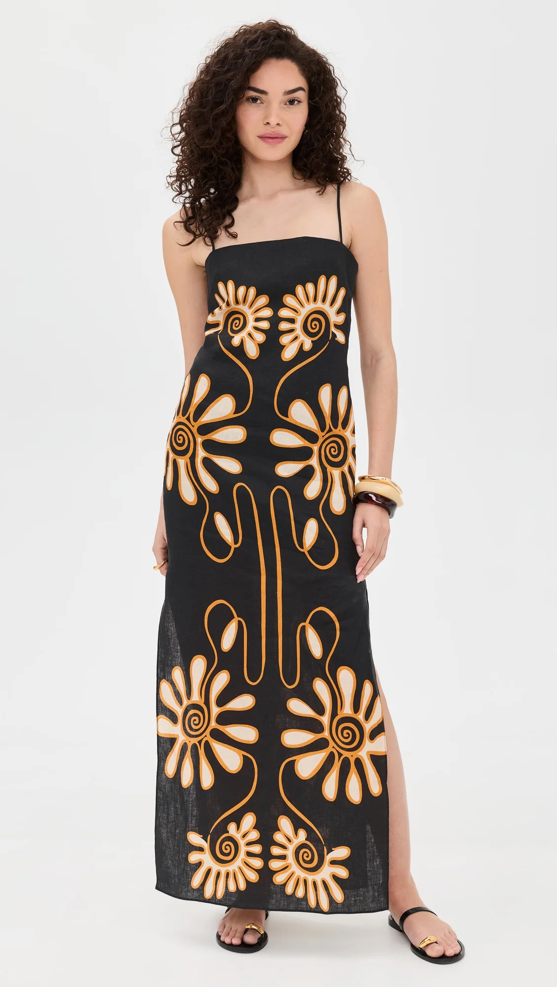 - Fabric: Mid-weight, non-stretch linen weave - Side slits - Floral print - Midi length - Square neckline - Adjustable shoulder straps - Hook-and-eye and hidden zip at side - Shell: 100% linen - Lined bodice, unlined skirt - Lining: 100% cotton - Dry clean - Imported, Colombia Style #CARAD30058