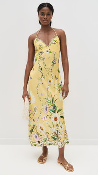 - Fabric: Lightweight, non-stretch silk charmeuse - Floral print - Rhinestone embellishments at neckline - Optional chain details at neckline and back - Maxi length - Halter neckline - Sleeveless - Pullover design, no closure - Shell: 100% silk - Unlined - Dry clean - Imported, China Style #CAMLA31013