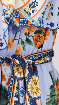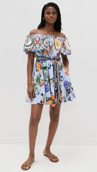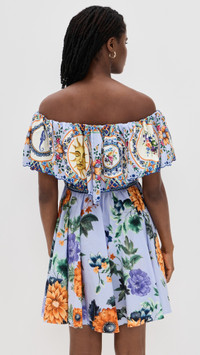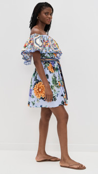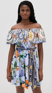 - Fabric: Lightweight, non-stretch poplin - Floral print and rhinestone embellishments - Gathered overlay at neckline - Mini length - Off-shoulder neckline - Short sleeves - Covered elastic waistband - Tie self-belt - On-seam side pockets - Shell: 100% cotton - Lined - Dry clean - Imported, India Style #CAMLA31008